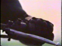 Close on Masked Rider's left hand, gripping one of Combat Chopper's handles. |