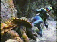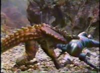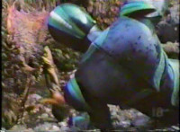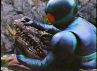 Continued, Masked Rider keeps trying to unclench Cyborgator, only for the creature to reach up and pull him down. |