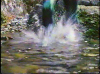 In front of a waterfall, slight zoom in on Masked Rider nod-talking. |