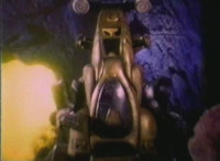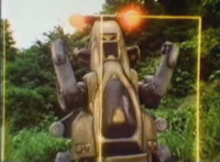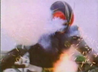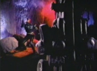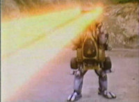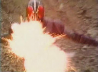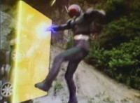 Masked Rider flips over away from Revenator, and poses. Revenator opens his faceplate and fires barrels, bursting around Masked Rider, blowing up the rest of the cave, causing the cave opening to explode with dust, and Masked Rider flips over. |