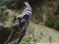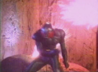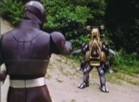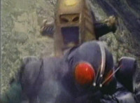 Masked Rider lands outside, posing. Revenator is also there, so Masked Rider leaps up and over Revenator, who helps to flip him away, only for Masked Rider to bounce off a cliff wall, and return with a punching fist. Revenator summons up a force field, which Masked Rider's punch bounces off electrically, knocking him over. Masked Rider recovers, but Revenator blocks his next hit, them takes him in a hold from behind. Masked Rider struggles as he talks, Revenator replying, then soon turning our hero around and knocking him into the air. |