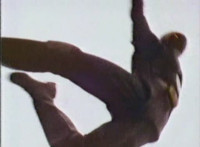 Super Blue gestures arms, then leaps up, throws a kick down into Revenator on his way by him, dazing the monster. |