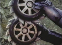 Now in a quarry, Revenator tosses a pair of bladed tires forth, spark bursting Masked Rider. Revenator reaches in to grab Masked Rider, who recovers, and kicks his enemy a few times, only to get grabbed from behind again. |