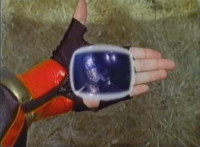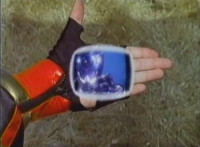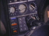 Close-up of Masked Rider pressing buttons on Magno's dashboard. |