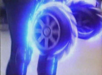 The bladed tires roll up Masked Rider's legs, cutting him with energy. |