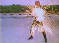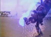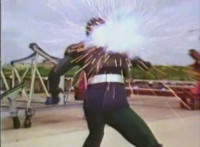 Masked Rider, struck by blue beams, spark bursts and falls over. |