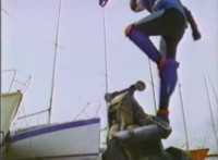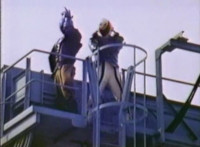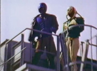 Split from prior shot; cuts follow-ups of Super Blue turning back into regular Masked Rider and stabbing Revenator until he explodes; US replaces it with Super Blue using Blue Saber to shoot lasers at him. |