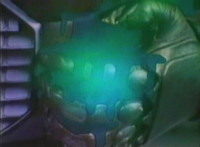 Close-up on Masked Rider's gut side, bleeding green goo. |