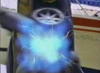 Revenator readies arms. Masked Rider turns to face him. Revenator zaps at Masked Rider with his headlights, but the beams burst on the ground harmlessly, as Masked Rider turns into liquid energy mode, swoops up and around Revenator, spark bursting him down, before rematerializing in Super Blue form! Super Blue poses. |