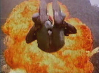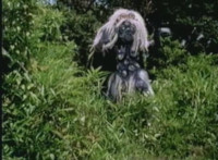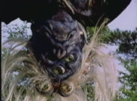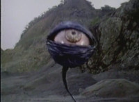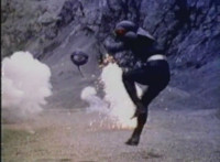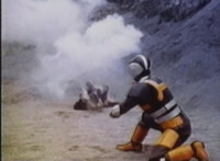 Ocusect recovers, talks, then grips her staff and uses it to transform herself into her giant floating eyeball form. Masked Rider reacts, before Ocusect fires beams off at him, bursting around him, as he dodges the blasts. Masked Rider rolls out of the way, then leaps up, and Ocusect creates a fireball explosion behind him as he flips over, then lands, still across the field from Ocusect. The giant eyeball floats forth, thrice, so Masked Rider gestures and summons. |