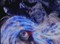 Extreme close-up of Ocusect, upside down, extending energy tendrils from her scalp eyes. |