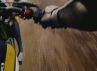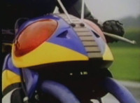 Masked Rider flips over in the air, and lands on Combat Chopper, racing forth without stopping. |