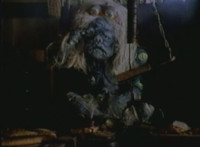 Ocusect lowers from the ceiling and stands right side up again, talking and laughing. |