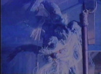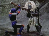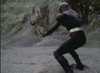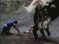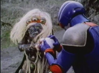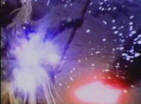 Super Blue rolls over, kicks at Ocusect, then she attacks with her staff, which he grabs the tip of, trying to crush it between his hands. This upsets her, so he releases and then kicks at her, but ends up staff struck away. Super Blue recovers and poses, as Ocusect caresses her staff. Super Blue transforms to Super Gold, posing. Ocusect reacts and points her staff forth. Super Gold pulls out his Ecto Ray and fires back when she fires first from her staff. They exchange fire, Super Gold rolling forth and firing more, hitting her directly, bursting her. |