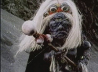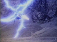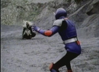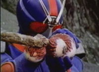 Masked Rider whips his glowing Electro Saber around, then tosses it forth, impaling it in Ocusect's giant eyeball! Masked Rider poses, then leaps up and grabs the hilt of the saber as Ocusect crackles. Masked Rider talks, then continues to hold on to his saber as the eyeball hovers up and down, he even begins to strike at Ocusect. |