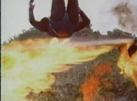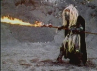 Continued, Ocusect slashes at Super Blue, who dodges. She then talks while pointing her eye staff at him, he reacts, then she thrusts her staff forth, spewing a flame thrower from it at him. Super Blue dodges the flames as best he can, before finally just jumping over them, smacking the staff tip as he passes overhead. He lands opposite of her, she turns around and talks. |