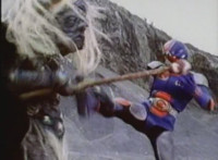 Ocusect trembles, Super Blue poses then rushes forth, attacking Ocusect, they fight, he kicks at her and punches at her and she uses her staff to block. |