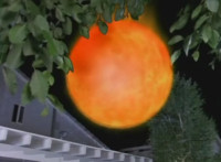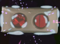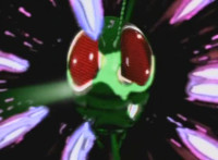 The fireball swoops through space, creating the Masked Rider logo, then transforming into the headshot of the titular character. |