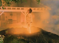 Dex stands in the yellow smoking crater of the Stewarts' backyard, looking up at their house. |