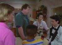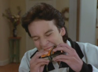 Dex sits at the kitchen table with the Stewarts as Barbara gives him a juice box, which he proceeds to chomp down on. |
