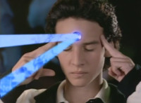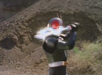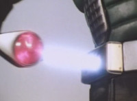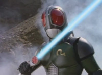 Masked Rider whips his Electro Saber around, then fires a bolt of energy from its glowing tip. |