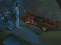 Masked Rider stands on the edge of a cliff, between Combat Chopper & Magno. |