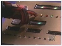 Close up of Alpha's hand, pressing, on console, upper section amber button, then middle section's middle red, then right button. |