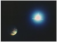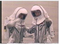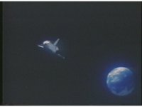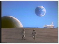 Astronauts walk on surface of Planetoid, with shuttle, Earth & Moon behind them. |