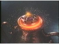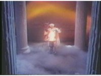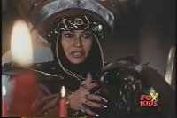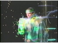 Slow push in on humanoid Zordon, motioning his arms behind a flaming altar. |