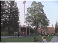 Pan down from flagpole, to courtyard of Angel Grove High School, guy and girl sitting on grass. |