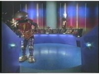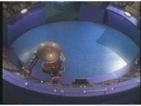 Alpha 5 watches Viewing Globe with his back to us, then turns around to look up at Zordon, motioning hands while talking. |
