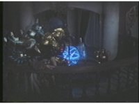 Alpha 5 watches Viewing Globe with his back to us, then turns around to look up at Zordon, motioning hands while talking, before nodding and stepping forth. |