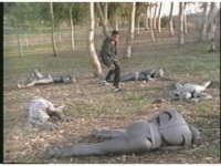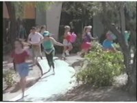Endless stream of citizens flee from the Youth Center into all directions, as camera tracks right. |