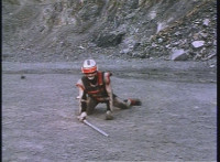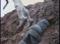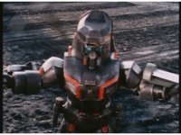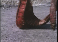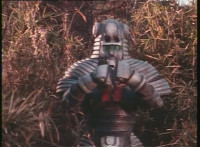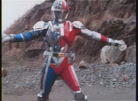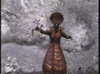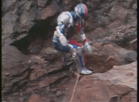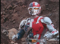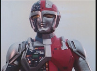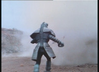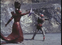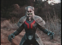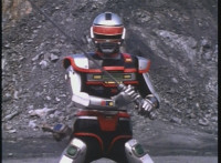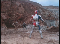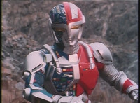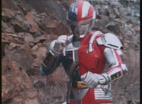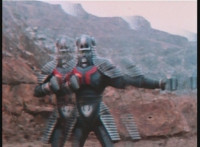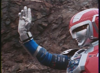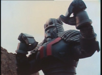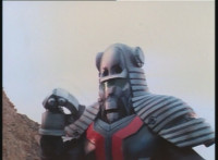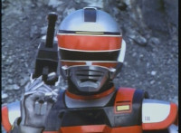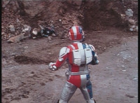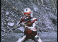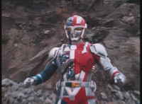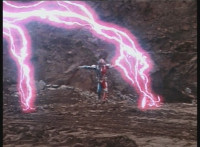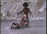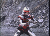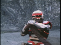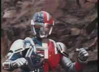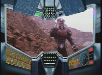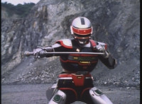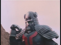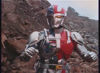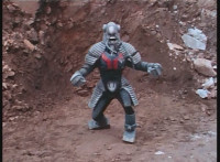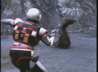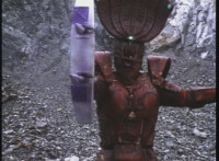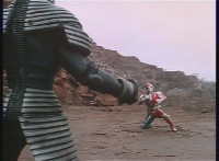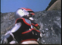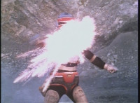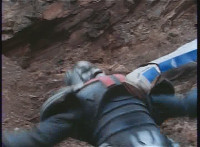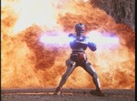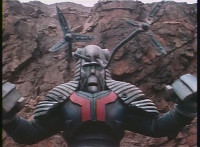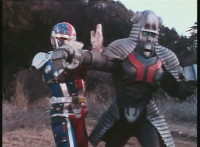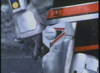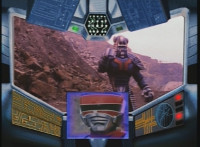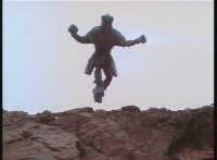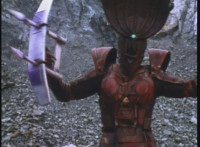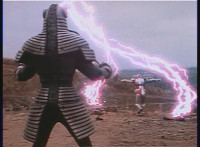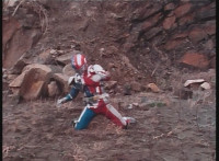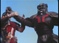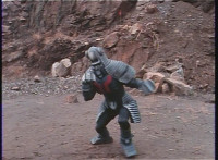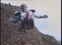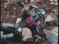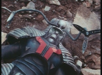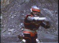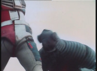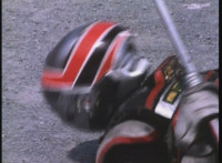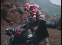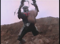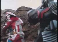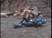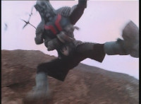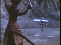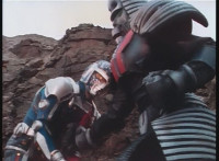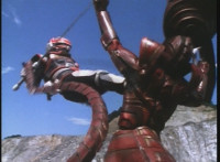 Being strangled by Cobrot's tail, VR JB struggles, then leaps up and dives past Cobrot twice, finally freed he falls to the ground, landing near his saber, which he picks up and poses with. |