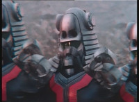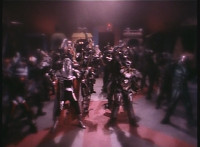 The virtual mutants all raise their right arms into the air to hail Grimlord, then lower them. |