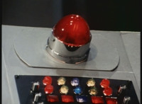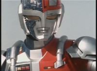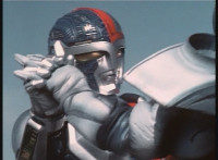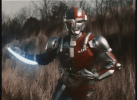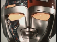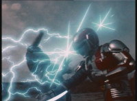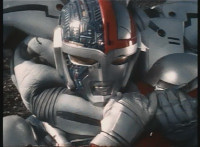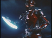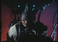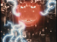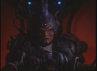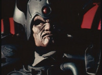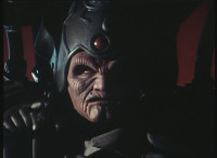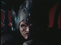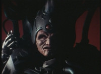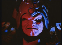 Close-up of Grimlord silent against a black background as a red flashing light fades to a bluish one. |