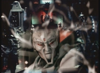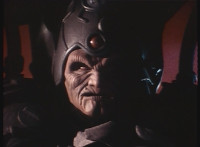 Sharp zoom in on Grimlord, talking as his eyes glow red, then his right fist clenches and glows red as well. |