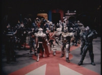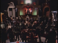 Distant shot of the room full of virtual mutants watching Grimlord as Decimator briefly bows. |