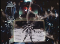 Grimlord's energy summons an energy screen above the mutants in the Dungeon, forming an image of Cannonbot in a snowy field. |