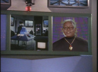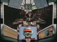 Grimlord's energy summons an energy screen above the mutants in the Dungeon, forming an image of Colonel Icebot as he talks close with a fist raised that he slowly lowers. |