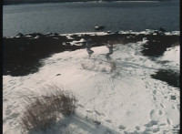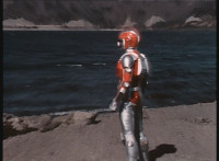 Cuts follow-up of him wandering away from Cannonbot and to the shoreline. |