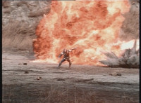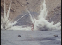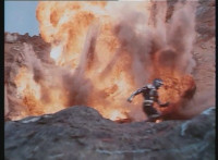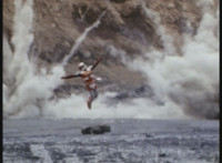Five explosions erupt in the quarry around VR JB as he runs, flips, and dives away from them. |