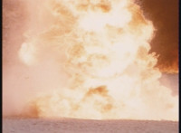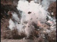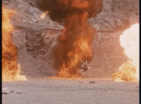 Shaky cam zoom in on VR JB being bombarded and engulfed by dirt bursts. |