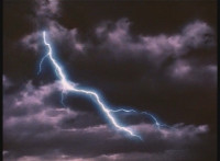 A Quantum Cruiser flies down through the clouds firing pink electricity. |