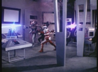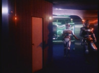 VRs JB & Kaitlin rush down a narrow, silver-walled hallway, then pass a matte painting of a circuitry wall, VR Kaitlin firing first upon the lab of Skugs, she and VR JB then begin to open fire on the Skugs, blasting them down all over the room. Finally, the pair head down another hallway. |