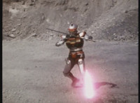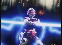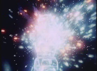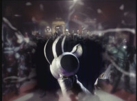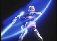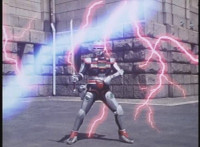 VR JB motions his arms about while his body trails, until he erupts into sparkle particles that reassemble as a giant energy image of him using the VR Techno Bazooka, firing both cannons forth. |