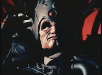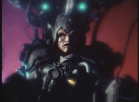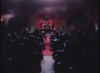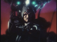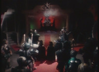 The camera lowers into the Virtual Dungeon, as Grimlord addresses his assembled Mutants, a pair of women kneeling in the middle, quick zoom in on Grimlord. |