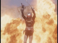 Eliminator, slashed by an energy slash, crackles and smokes, VR JB slashing again, before turning around and posing as Eliminator collapses behind him and explodes massively. |