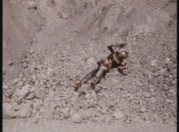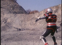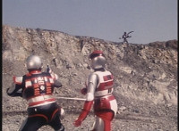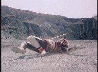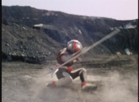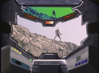 VRs JB & Kaitlin ready their Pistols, Eliminator's chest monitor shows static, so the pair fire up at him, bursting him into falling off the cliff and onto the quarry ground as VR JB faces him. |