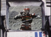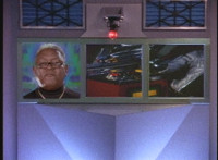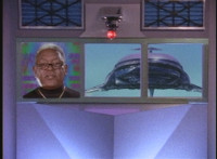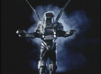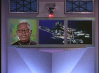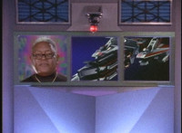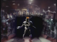 Close-ups of Eliminator in a dark room, as the virtual mutants watch from behind the energy screen. |